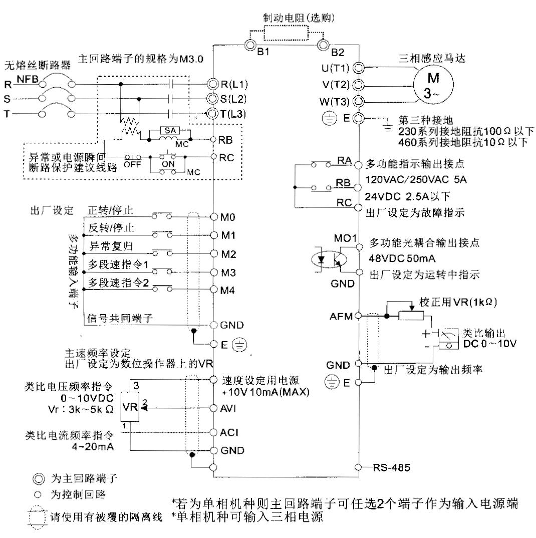 交流馬達(dá)驅(qū)動(dòng)器端子目務(wù)必正確的接地。230V系列第三種接地,460V系列接地。